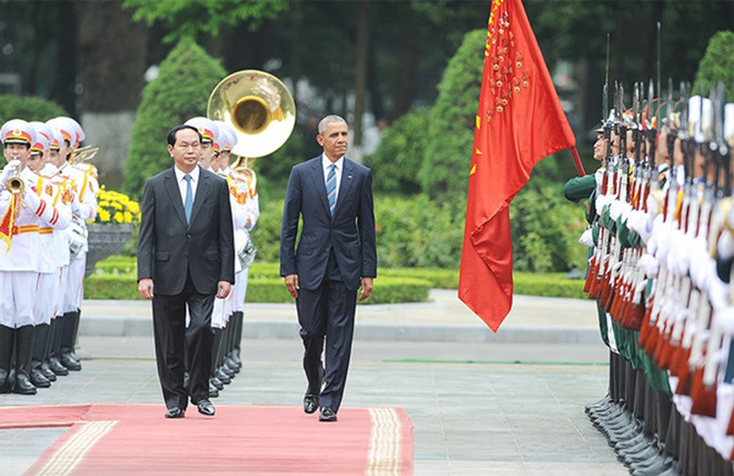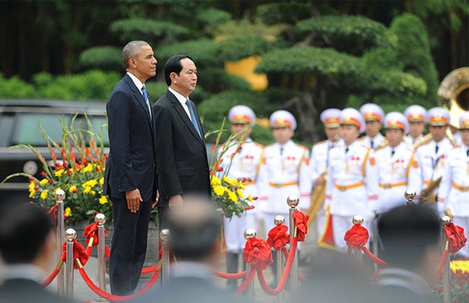 Chủ tịch nước Trần Đại Quang và Tổng thống Mỹ Barack Obama duyệt đội danh dự.