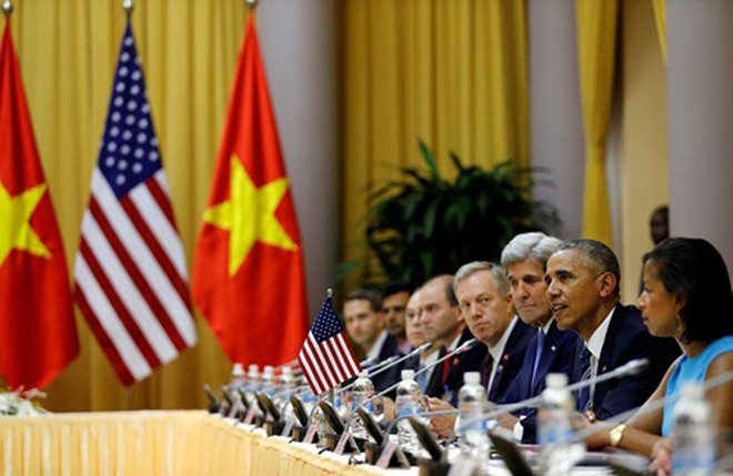 "Dù chúng ta đang nói về quan hệ thương mại và kinh tế hay tham vấn quân đội với quân đội, hay hoạt động nhân đạo, hay các vấn đề hậu quả chiến tranh..., trên mọi mặt những gì chúng ta thấy là hợp tác được tăng cường vì lợi ích của nhân dân hai nước", Tổng thống Mỹ nói. Ảnh: Reuters