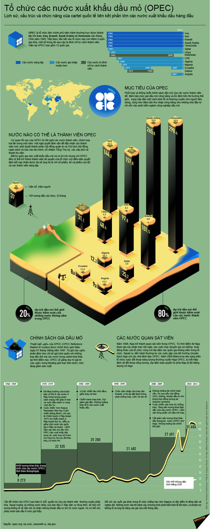 OPEC thành lập khi nào và để làm gì, những nước nào tham gia tổ chức và họ ảnh hưởng đến giá dầu thế giới ra sao, phải chăng chính sách của tổ chức này luôn luôn có lợi cho tất cả các thành viên - tất cả những câu hỏi này và những điều khác nữa được trình bày qua đồ họa thông tin của Sputnik.