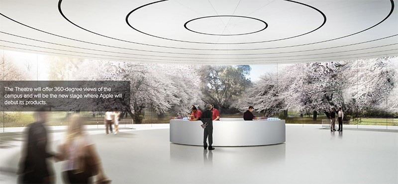 Trong khi rất nhiều thông tin chi tiết về Toà nhà chính của Apple, nơi có sức chứa khoảng 13.000 nhân viên được tung ra vào năm ngoái, thì dường như khu “Nhà hát” đang được giữ kín tiếng hơn hẳn cho đến bây giờ. Khu nhà hát rộng 36.576 mét vuông, với sức chứa 1.000 chỗ ngồi, là một thính phòng dưới lòng đất. Được thiết kế bởi công ty kiến trúc Foster + Partner tại Anh Quốc, kiến trúc hình trụ này có thể được quan sát từ mặt đất và không có bất kỳ cột chống nào. Thay vào đó, không gian mở, được bao xung quanh bằng kính và sẽ có bậc thang xuống đến sảnh hội trường.