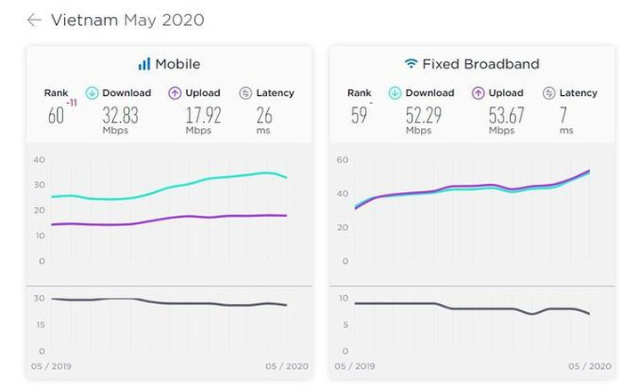 Cụ thể, Việt Nam đứng thứ 59 trên bảng xếp hạng di động với tốc độ tải xuống trung bình 32,83 Mbps, giảm một chút so với tháng 4. Tốc độ này thấp hơn so với con số tải xuống trung bình 33,71 Mbps trên bảng xếp hạng. Tuy nhiên, tốc độ tải lên và độ trễ của Việt Nam đều trên mức trung bình.