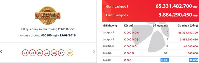 Qua xác định từ hệ thống kinh doanh xổ số tự chọn, Vietlott xác định có 1 vé trúng Jackpot 2 với giá trị giải là 3.884.290.450 đồng (chưa khấu trừ thuế thu nhập cá nhân theo quy định nhà nước). Trong khi đó, giải Jackpot 1 trị giá 65.331.482.700 đồng vẫn chưa tìm được chủ nhân.