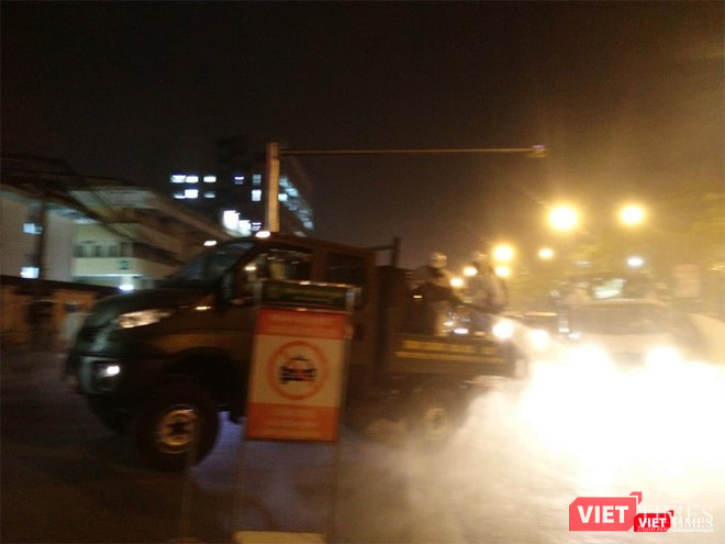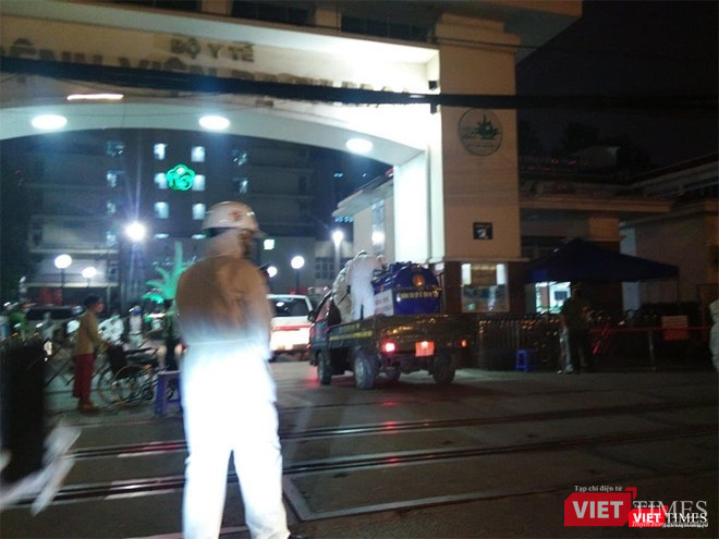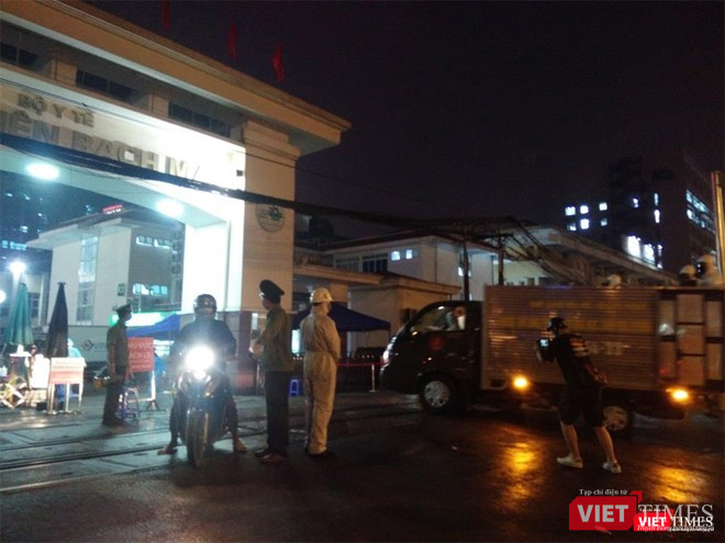 Đúng 19h đoàn xe của Binh chủng Hóa học đi từ hướng đường Giải Phóng vào cổng chính Bệnh viện Bạch Mai làm nhiệm vụ trong sự bảo vệ và hướng dẫn giao thông nghiêm ngặt của Công an quận Hai Bà Trưng, Hà Nội.