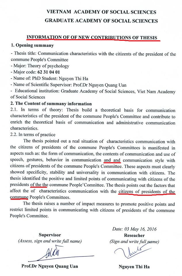 | Bản tóm tắt tiếng Anh của luận án"Đặc điểm giao tiếp với dân của chủ tịch xã" được đăng trên webiste của Học viện Khoa học Xã hội |