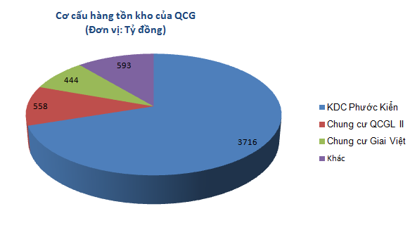 Quốc Cường Gia Lai (QCG) cũng là một trong những doanh nghiệp BĐS có lượng hàng tồn kho lớn. Theo báo cáo tài chính của công ty này, tính đến 30/9/2015 giá trị hàng tồn kho ở mức 5.311 tỷ đồng, chủ yếu là các dự án đang triển khai dở dang. Trong đó, đáng chú ý Dự án khu dân cư Phước Kiển chiếm đến hơn 70% giá trị hàng tồn kho với 3.715 tỷ đồng, tiếp đến là Dự án chung cư QCGL II với 557 tỷ đồng hàng tồn kho.