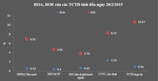Hiệu quả kinh doanh của hệ thống các TCTD tiếp tục không có gì thay đổi so với tháng trước khi mà ROA và ROE của toàn hệ thống vẫn lần lượt đạt 0,51% và 5,49% trong tháng 2/2015.