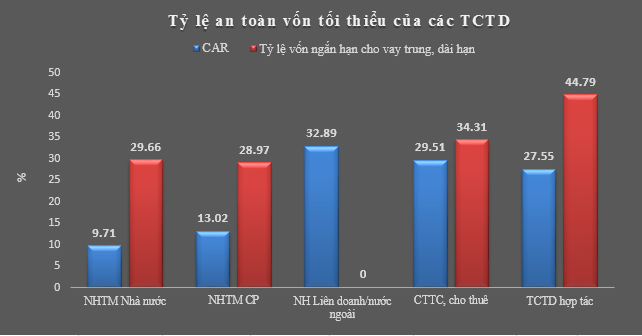 Tỷ lệ an toàn vốn tối thiểu của toàn hệ thống là 13,42%, thấp nhất là các ngân hàng TMCP Nhà nước với tỷ lệ 9,71%, cao nhất là khối các ngân hàng liên doanh, nước ngoài với tỷ lệ 32,89%.