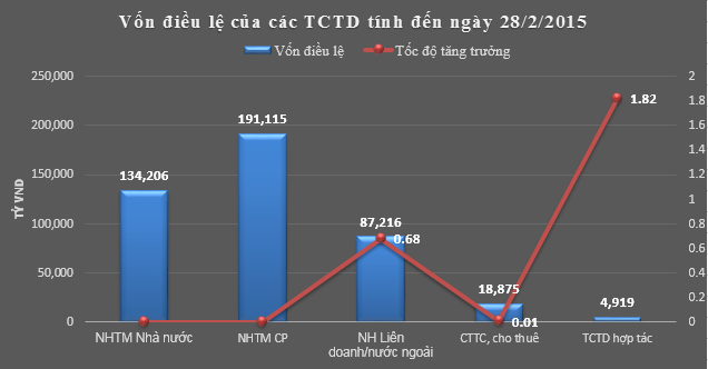 Vốn điều lệ trong tháng 2/2015 chỉ tăng 0,16% so với cuối năm 2014, đạt 436.331 tỷ đồng toàn ngành. Đáng chú ý, trong 2 tháng đầu năm nay, vốn điều lệ tại nhóm các ngân hàng thương mại cổ phần và Nhà nước không tăng trưởng.