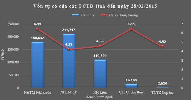 Vốn tự có của các tổ chức tín dụng đạt 522.031 tỷ đồng, bất ngờ tăng 5,13% so với cuối năm 2014 trong đó vốn tự có của hệ thống các công ty tài chính, cho thuê tài chính tăng mạnh nhất với tỷ lệ 6,45% lên 16.188 tỷ đồng.