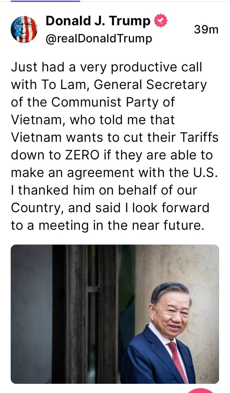 Theo đó, trên mạng xã hội Truth Social, Tổng thống Donald Trump viết: "Tôi vừa có một cuộc điện đàm rất hiệu quả với ông Tô Lâm, Tổng Bí thư Đảng Cộng sản Việt Nam. Ông Tô Lâm nói với tôi rằng Việt Nam muốn giảm thuế quan xuống mức 0 nếu có thể đạt được một thỏa thuận với Mỹ. Tôi đã thay mặt đất nước chúng ta cảm ơn ông, và nói rằng tôi mong đợi một cuộc gặp trong thời gian tới".