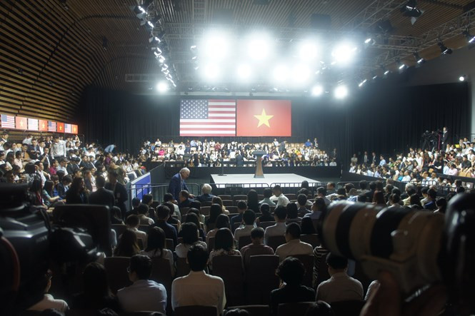 Tổng thống Obama tiếp lời: Cần nhớ rằng ở Việt Nam, 2/3 người dân sinh sau năm 1975. Các bạn nhìn ra thế giới với sự tươi sáng, không bị tư duy kiểu cũ. Các bạn có nhận thức, năng lực để không chỉ phát triển Việt Nam, mà còn định hình thế giới. Các bạn có công nghệ để kết nối.