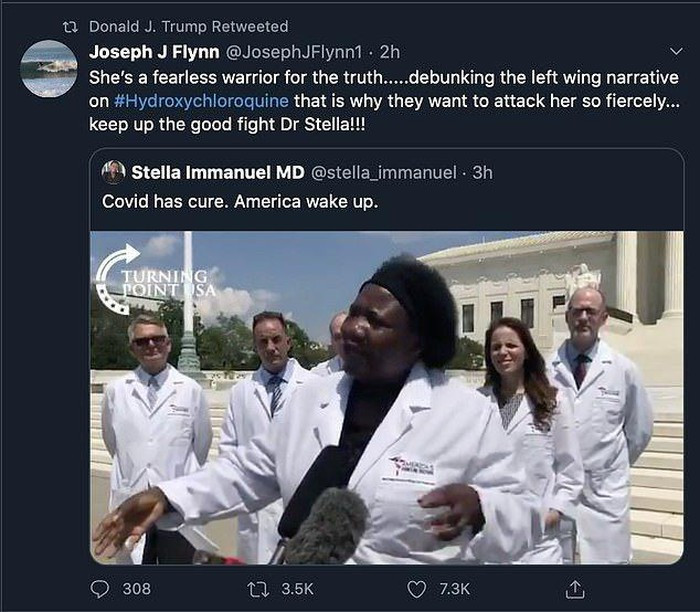 Một đoạn video được đăng tải bởi hãng truyền thông Breitbart News đang lan truyền rộng rãi tại Mỹ. Tuy nhiên ngay sau đó video này đã bị 3 nền tảng truyền thông xã hội là Facebook, Twitter và Youtube xóa hôm 27/7 với lý do truyền tải nội dung sai sự thật.