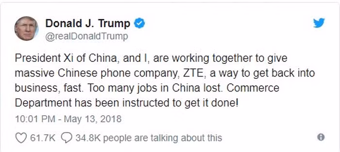 "Tổng thống Tập Cận Bình và tôi đang thỏa hiệp cùng nhau để cho phép cho công ty sản xuất lớn ZTE trở lại kinh doanh một cách nhanh chóng. Rất nhiều người tại Trung Quốc đã bị mất việc. Bộ Thương Mại cũng đang được hướng dẫn để hoàn thành các thỏa hiệp này".