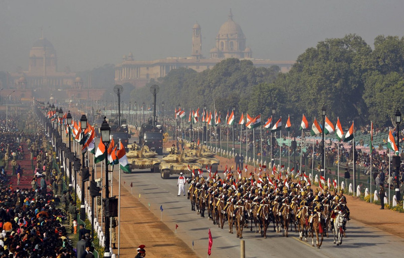 Các quân nhân Ấn Độ trong đội hình duyệt binh, theo sau là đội hình xe tăng Bhishma, phiên bản lắp ráp trong nước của xe tăng T-90S, đội hình xe phóng tên lửa BrahMos tham gia cuộc diễn tập diễu hành ngày lập quốc Republic Day. Cuộc duyệt binh tiến hành trên quảng trường Dinh Tổng Thống ở New Delhi, Ấn Độ, ngày 23.01,2009