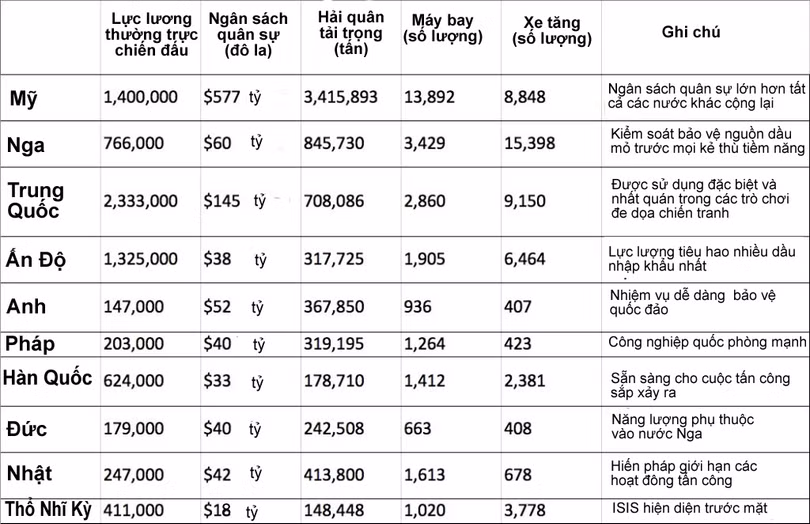 Bảng thống kê bao gồm 10 quân đội mạnh nhất thế giới với bản phân tích sức mạnh của mỗi quân đội của Global Firepower.