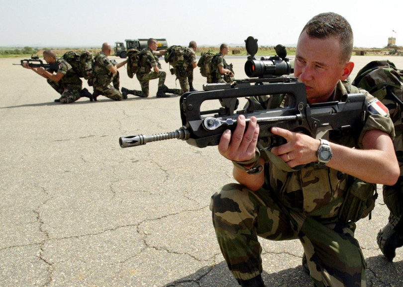 Binh sĩ tiểu đoàn 16 Hunter bảo vệ đường băng tại sân bay Abeche thuộc miền đông Chad 04.08,2004 khi quân đội Pháp lập cầu hàng không viện trợ nhân đạo. Quân đội Pháp đang tuần tra khu vực giữa biên giới và người tị nạn Sudan trại ở miền đông Chad và hỗ trợ các tổ chức viện trợ trong phân phối hàng cứu trợ cho người tị nạn chạy trốn khỏi cuộc xung đột đang tàn phá khu vực Darfur của Sudan.