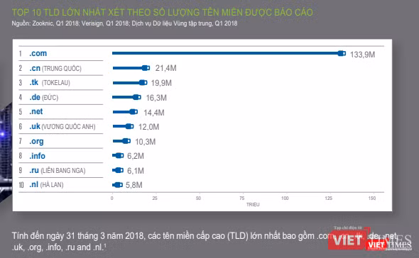Tổng số lượt đăng ký các tên miền cấp cao .com và .net đạt khoảng 148,3 triệu lượt, tính đến cuối quý I/2018, với mức tăng khoảng 1,9 triệu lượt so với quý IV/2017.