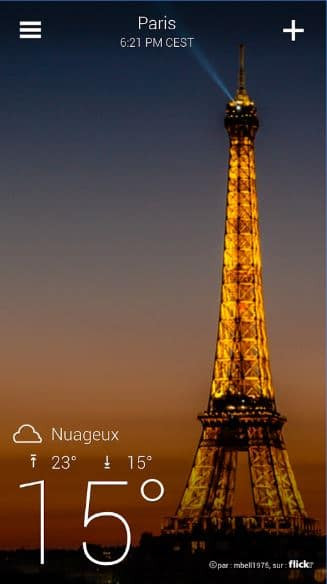 Đây là ứng dụng thời tiết đẹp nhất trong bảng danh sách này.Tất nhiên, ứng dụng cũng cung cấp thông tin thời tiết rất đáng tin cậy vì nó được dựa trên Weather Underground, một mạng lưới trạm khí tượng cá nhân. Ngoài thời tiết, Yahoo cung cấp hình ảnh phía sau thông báo thời tiết liên quan đến thành phố mà bạn đang có mặt, bức ảnh này được lấy từ Flickr, dịch vụ chia sẻ ảnh của Yahoo.