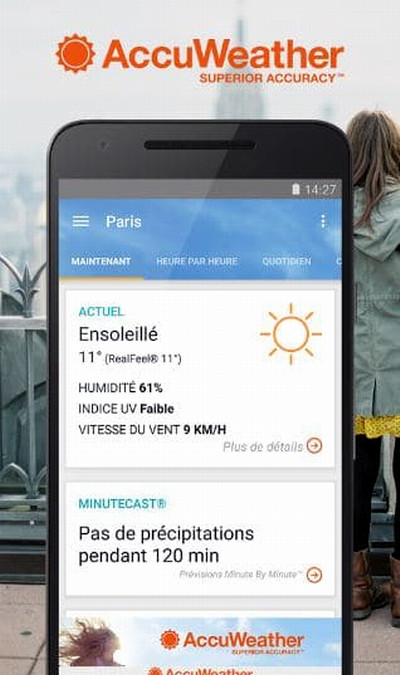Ban đầu, AccuWeather hoạt động như trang web số 1 trong lĩnh vực dự báo thời tiết. Có trụ sở đóng tại Mỹ, dịch vụ tư nhân này có sẵn trong nhiều ngôn ngữ và tiếp tục cải thiện chất lượng thông tin cung cấp để giữ vị trí số 1 của mình trong lĩnh vực này. Ứng dụng AccuWeather làm rất tốt vai trò của mình. Người dùng có thể dễ dàng di chuyển giữa các menu và thông tin thời tiết đến với họ có độ chính xác cao. Ứng dụng còn cung cấp tính năng dự báo cứ mỗi hai giờ để báo cho bạn trời mưa hay không và nếu mưa thì lượng mưa sẽ như thế nào!