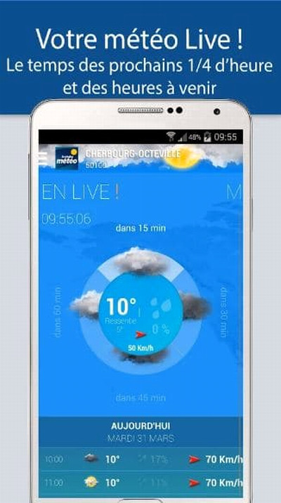 Nếu bạn muốn biết thời tiết chính xác nhất, tại sao bạn không dùng ứng dụng Météo Ciel ? Ứng dụng này cung cấp cho bạn những dự báo thời tiết cho A đến Z : ngắn hạn và dài hạn, kèm theo các bản đồ dự báo và trực tiếp trên nhiều mặt. Ứng dụng cung cấp dự báo thời tiết theo giờ của Météo France trên giao diện của nó. Không giống như các ứng dụng khác, Météo Ciel có nhiều mô hình thời tiết mà bạn có thể tham khảo.