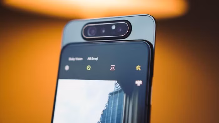 Samsung Galaxy A80: Cũng sử dụng thiết kế kiểu cụm camera xoay lật từ sau ra trước và sử dụng chung cụm camera này cho cả camera trước sau như Zenfone 6 để có được thiết kế màn hình tràn viền, nhưng Galaxy A80 có 3 camera được đặt trên một hệ thống trượt. Mặc định cụm camera này sẽ nằm ở mặt sau, nhưng khi chụp ảnh selfie thì camera này sẽ thò lên và xoay ra trước.