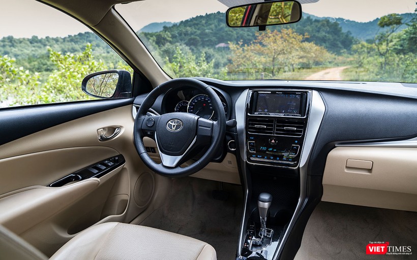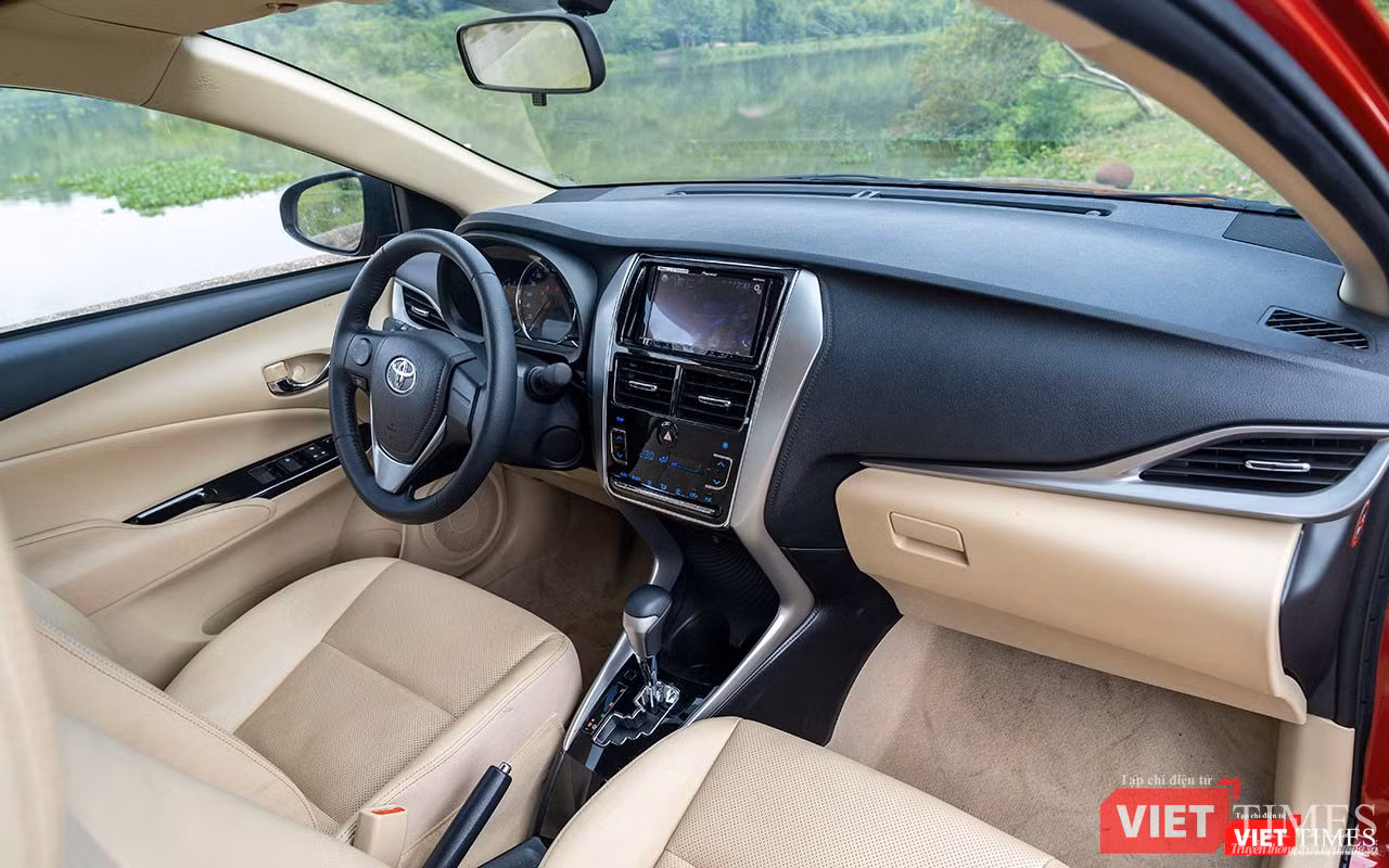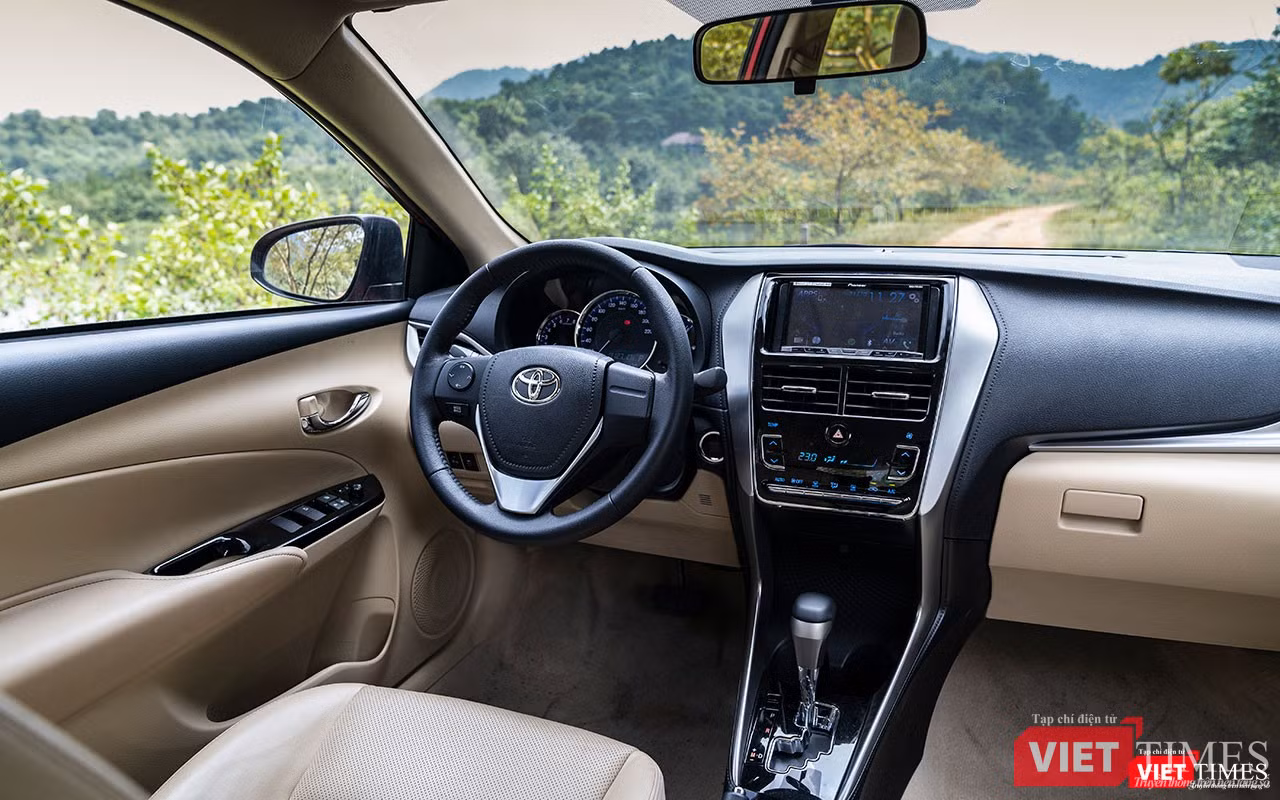 Vô-lăng 3 chấu của được bê nguyên thiết kế của đàn anh Corolla Altis. Trên phiên bản 1.5G, Vios 2018 sở hữu ghế ngồi được bọc da chỉnh cơ, vô-lăng bọc da có thêm nút điều chỉnh âm lượng, nút bấm khởi động Start/Stop Engine, đèn pha tự động, gập gương tự động và bảng đồng hồ Optitron với đèn nền xanh dương có màn hình điện tử hiển thị các thông tin hành trình.