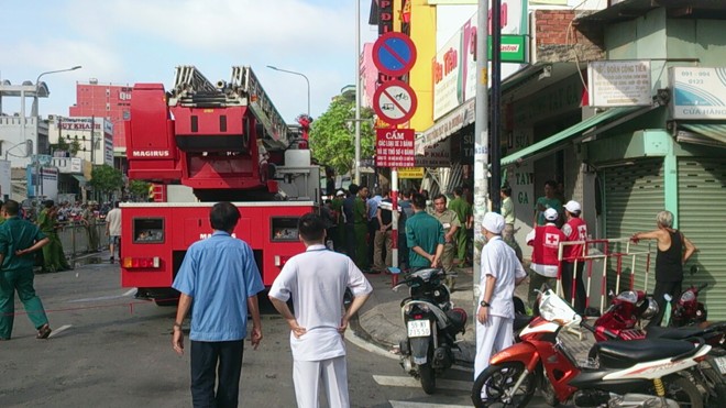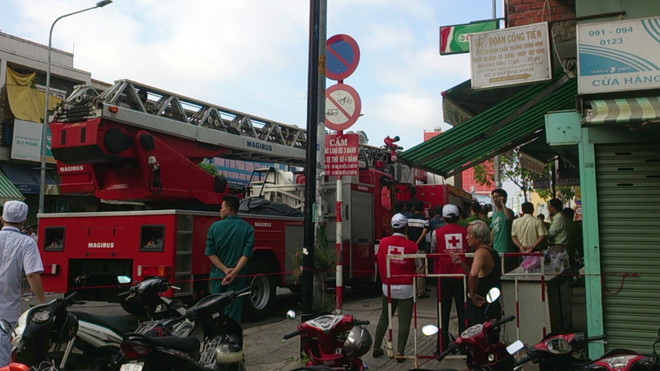 Người dân đã phá cửa sắt để vào trong chữa cháy nhưng bất thành. Phòng Cảnh sát PCCC quận Tân Phú đã điều xe chữa cháy chuyên dụng, trong đó có xe thang cùng hàng chục CBCS đến hiện trường triển khai chữa lửa.