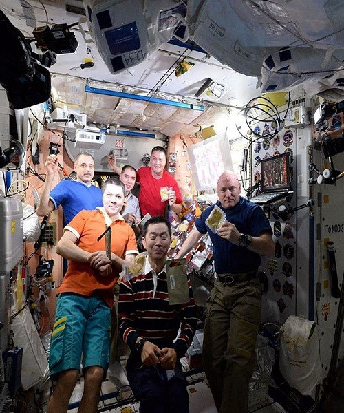 Trưởng đoàn phi hành gia Scott Kelly (ngoài cùng bên phải) làm việc trên ISS từ tháng 3/2015 và sống cùng 5 phi hành gia khác, gồm ba người Nga, đồng hương người Mỹ Timoti Kopra và phi công người Anh, Tim Peake. Trong ảnh, họ đang tổ chức bữa ăn tối trên ISS nhân dịp Lễ Tạ ơn ngày 26/11/2015.