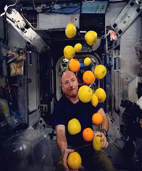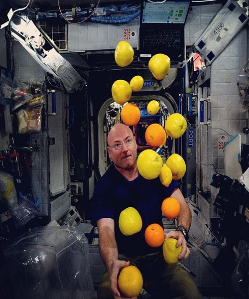 Scott Kelly tung hứng trái cây trong môi trường không trọng lực.