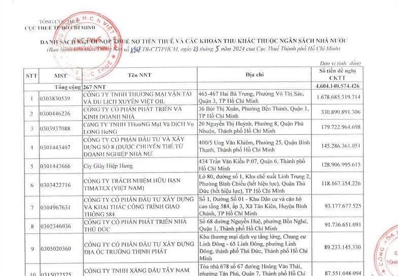 Đứng đầu danh sách nợ thuế là Công ty TNHH thương mại vận tải và du lịch Xuyên Việt Oil (Công ty Xuyên Việt Oil) với số tiền nợ 1.678,6 tỷ đồng.