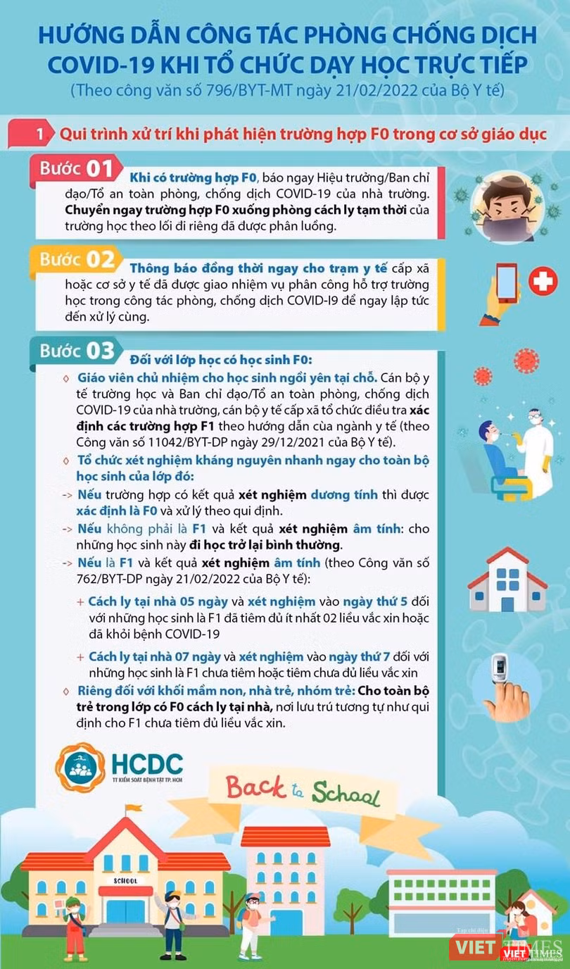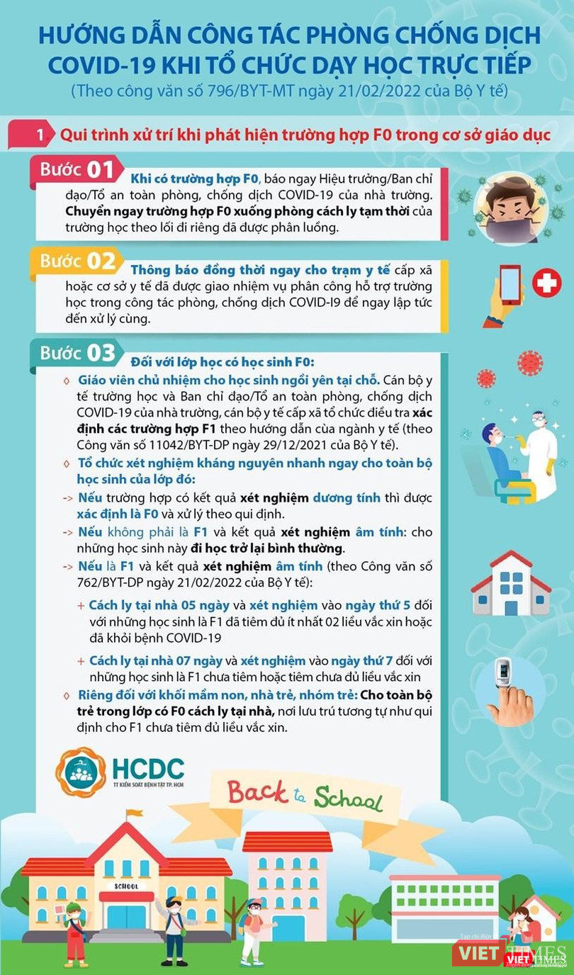 Trung tâm Kiểm soát Bệnh tật TP.HCM (HCDC) cũng cho hay, Bộ Y tế hôm 21/2/2022 đã ban hành hướng dẫn xử lý F0 trong trường học với quy định mới về thời gian cách ly F1.