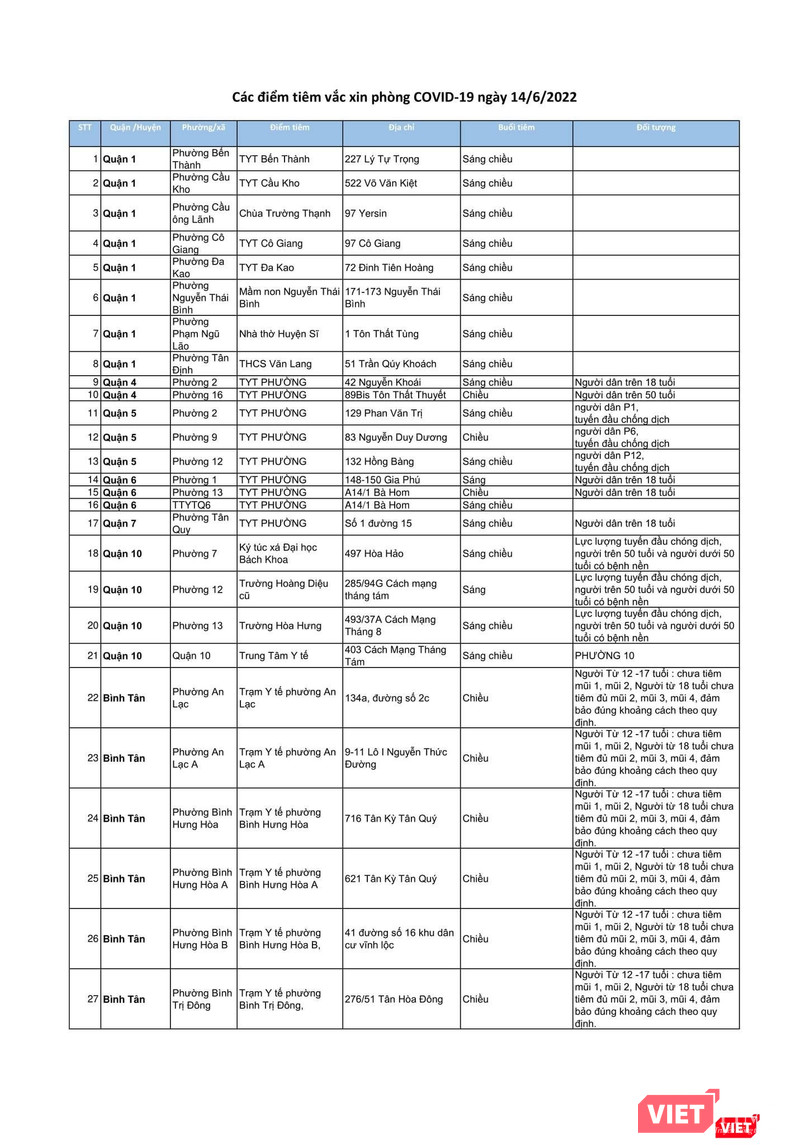 HCDC thông tin, kể từ ngày 14/6/2022, TP.HCM phát động tháng cao điểm tiêm chủng vắc xin phòng COVID-19 nhằm vận động người dân đồng ý tiêm chủng đúng lịch, đầy đủ các liều tiêm nhắc. Trong tháng cao điểm này, các UBND quận huyện, Thành phố Thủ Đức sẽ mở các điểm tiêm chủng cố định. Địa phương sẽ thông tin rộng rãi đến người dân đang sinh sống tại địa bàn về địa chỉ điểm tiêm cố định, thời gian tiêm, đối tượng tiêm.