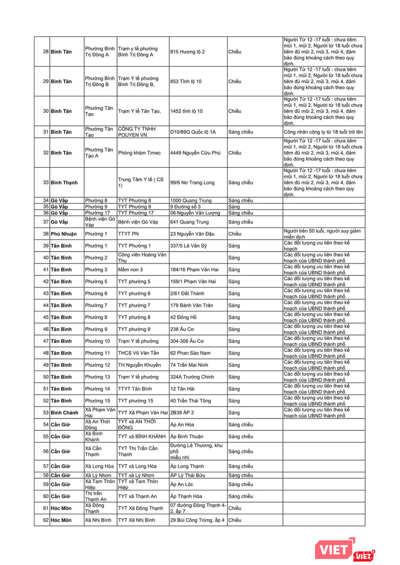 Dưới đây là danh sách các điểm tiêm chủng COVID-19 cố định tại TP.HCM.