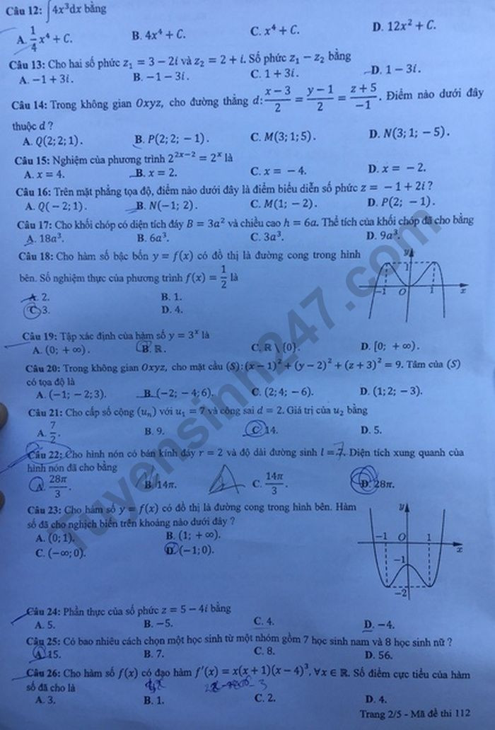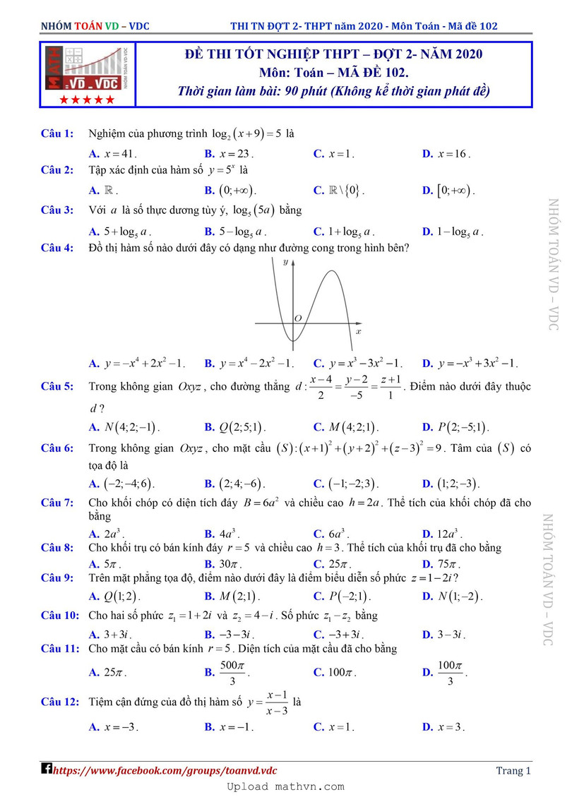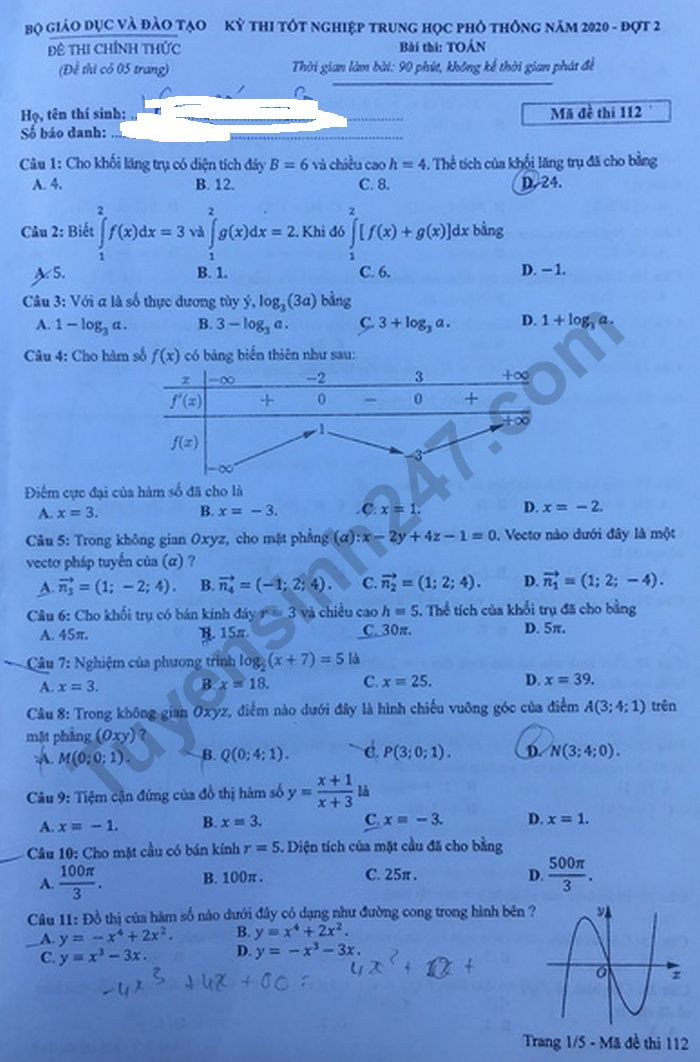 | Đề thi tốt nghiệp THPT năm 2020 đợt 2 môn Toán mã đề 112. Nguồn: TTHN |