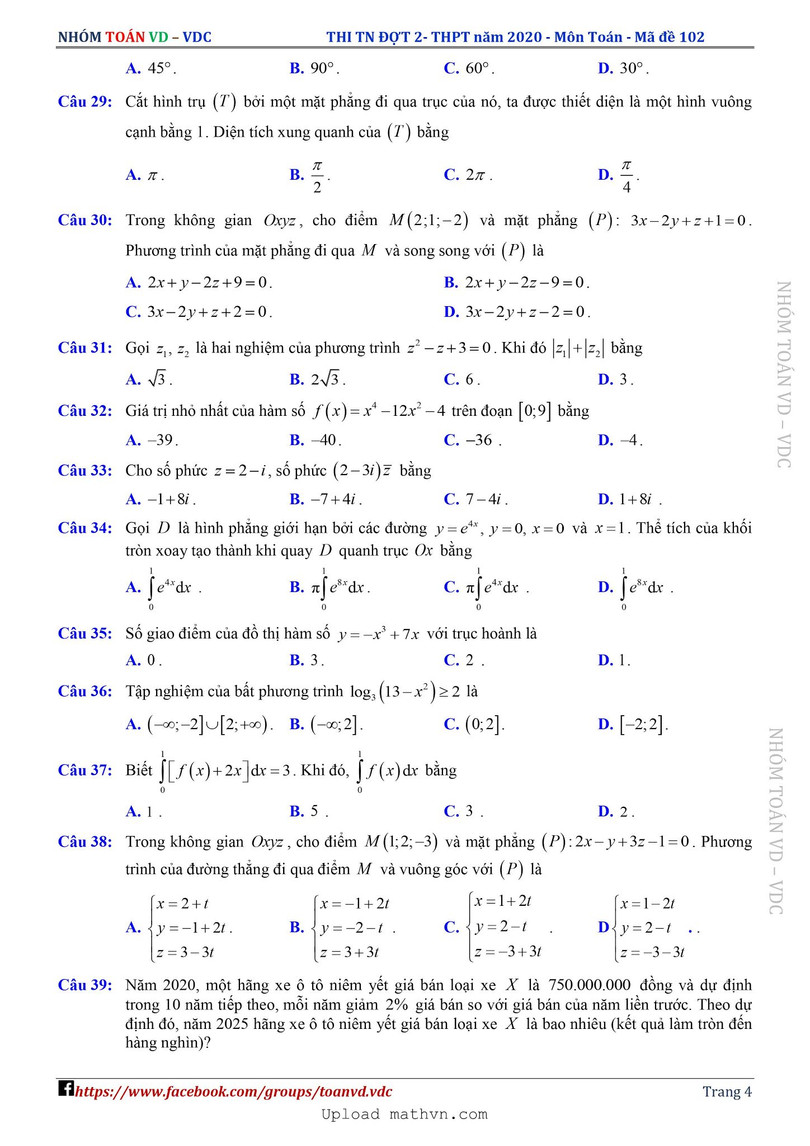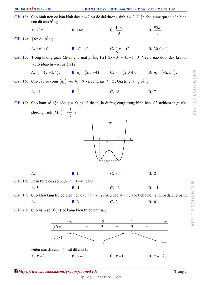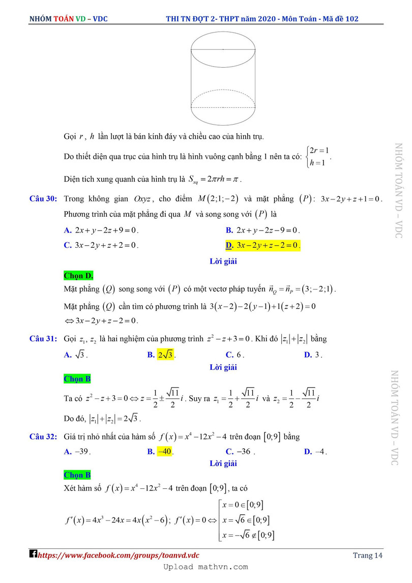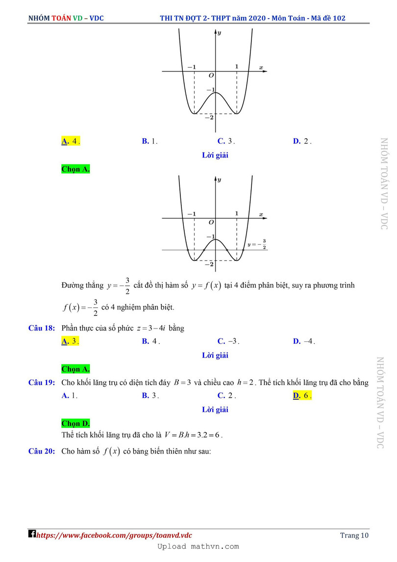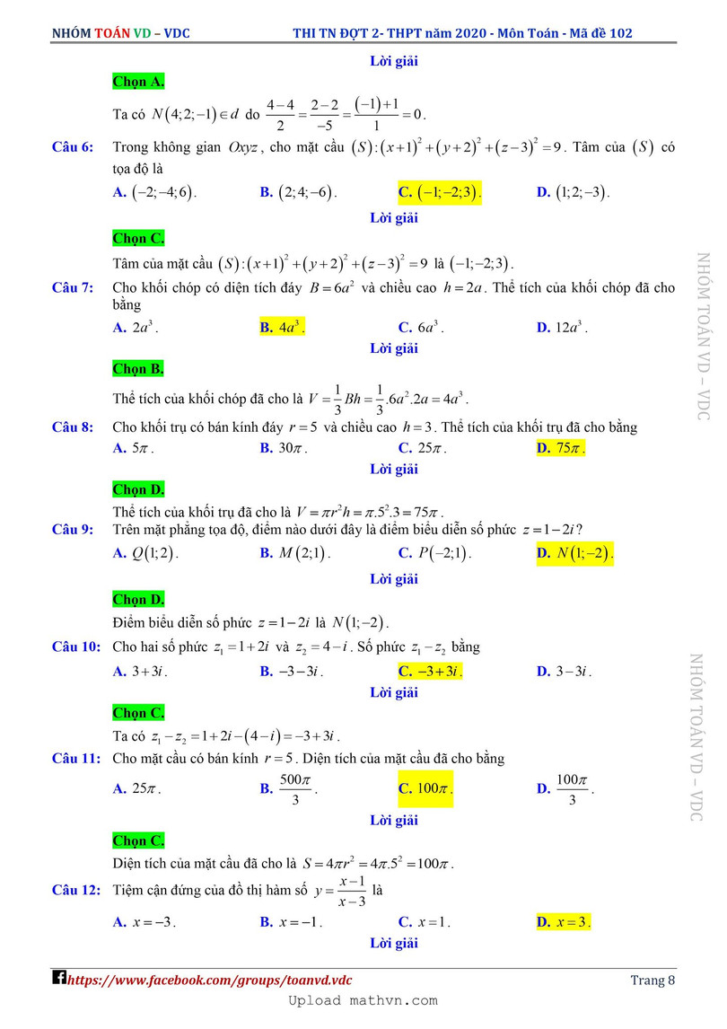 Xem lời giải chi tiết đề thi tốt nghiệp THPT năm 2020 môn Toán mã đề 102