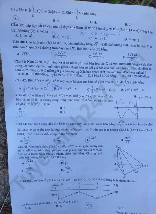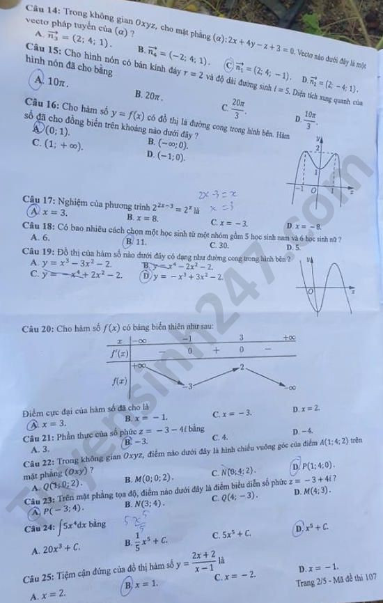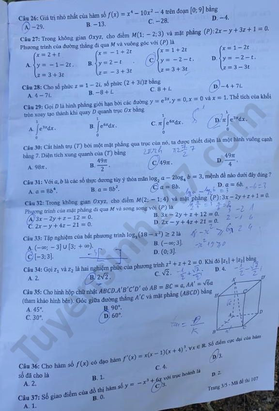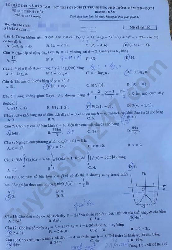 | Đề thi tốt nghiệp THPT năm 2020 đợt 2 môn Toán mã đề 107. Nguồn: TTHN |