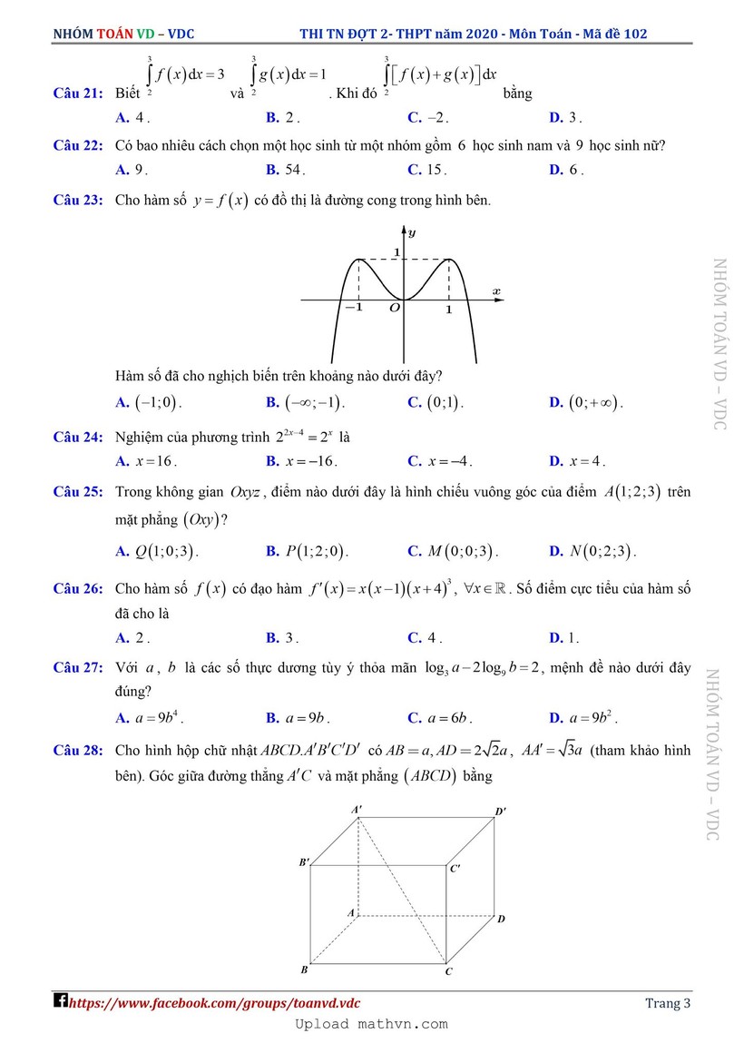 Đề thi tốt nghiệp THPT 2020 đợt 2 môn Toán - Tất cả mã đề gồm: 101, 102, 103, 104, 105, 106, 107, 108, 109, 110, 111, 112, 113, 114, 115, 116, 117, 118, 119, 120, 121, 122, 123, 124.