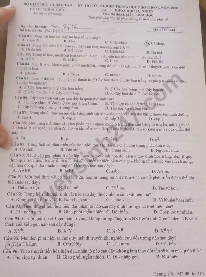 VietTimes – Đáp án đề thi tốt nghiệp THPT năm 2020 môn Sinh học mã đề 214 được VietTimes cập nhật nhanh chóng, chính xác. Chúc sĩ tử có kỳ thi tốt nghiệp THPT thành công!