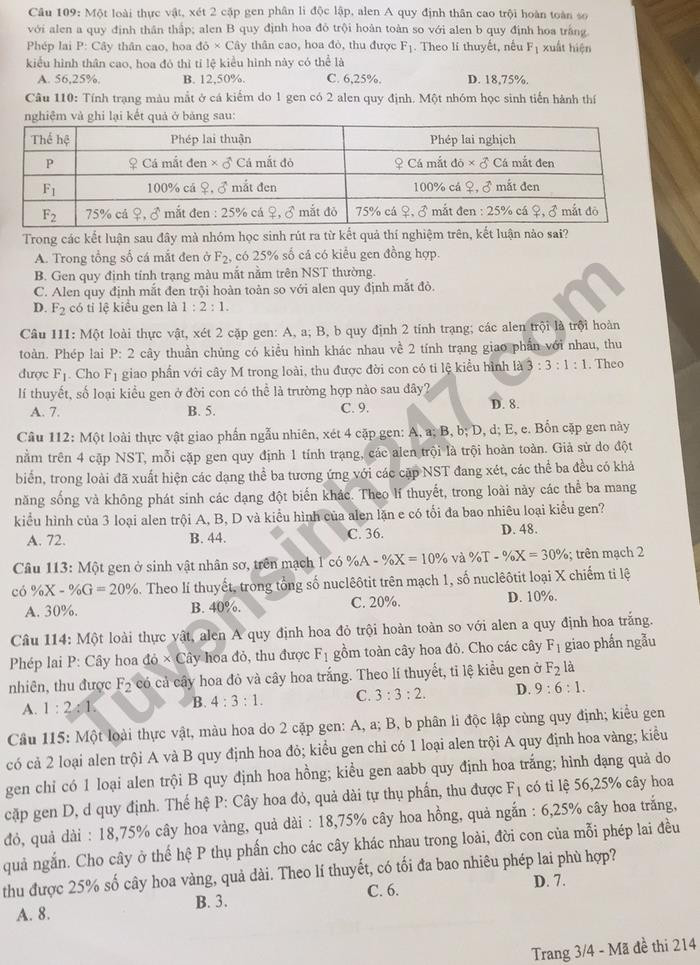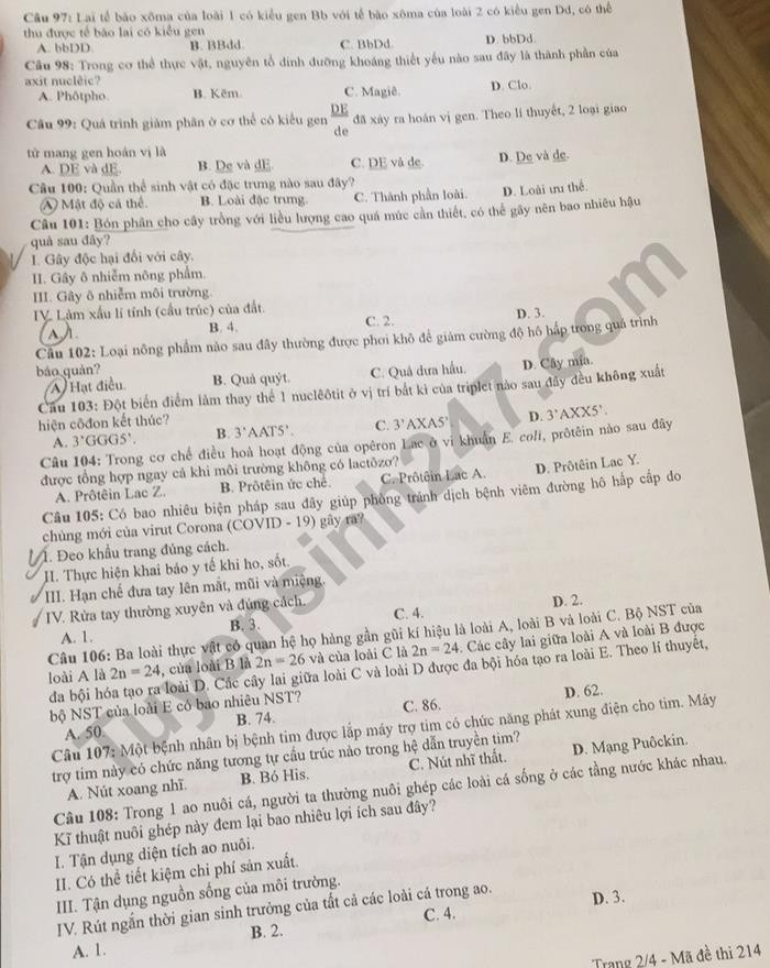 Đề thi và đáp án tham khảo đề thi tốt nghiệp THPT năm 2020 môn Sinh học mã đề 214 sẽ được cập nhật ở dưới đây.