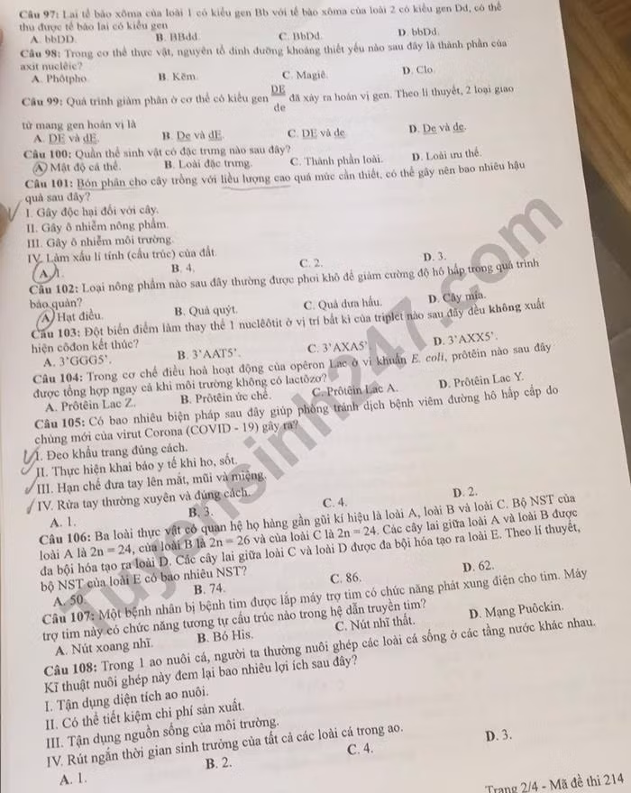 Đề thi tốt nghiệp THPT môn Sinh học 2020 - Tất cả mã đề gồm: 201, 202, 203, 204, 205, 206, 207, 208, 209, 210, 211, 212, 213, 214, 215, 216, 217, 218, 219, 220, 221, 222, 223, 224.