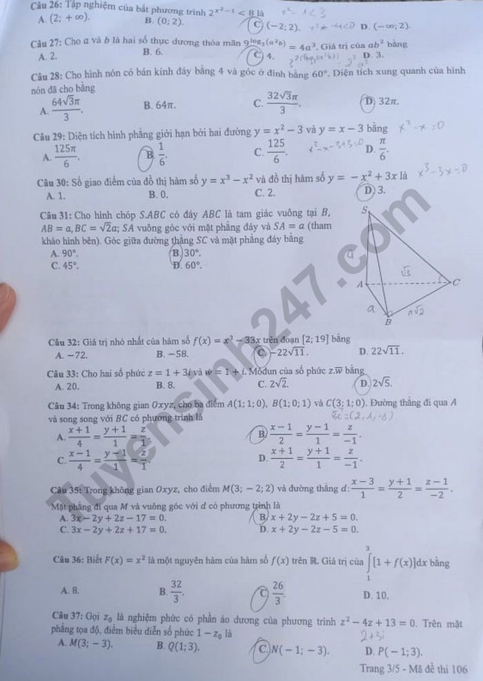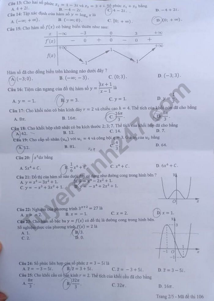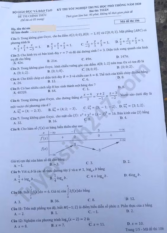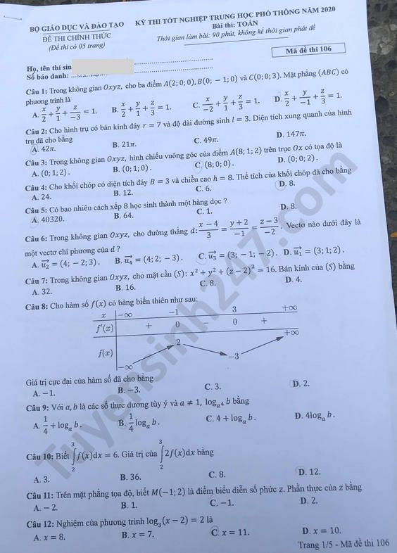 VietTimes – Đáp án đề thi tốt nghiệp THPT năm 2020 môn Toán mã đề 106 được VietTimes cập nhật nhanh chóng, chính xác. Chúc sĩ tử có kỳ thi tốt nghiệp THPT thành công!