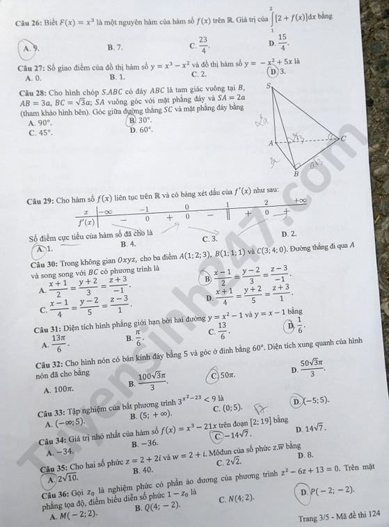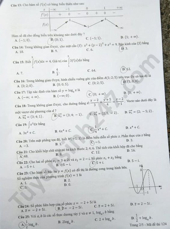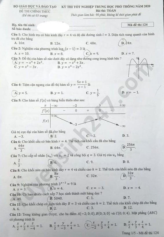 VietTimes – Đáp án đề thi tốt nghiệp THPT năm 2020 môn Toán mã đề 124 được VietTimes cập nhật nhanh chóng, chính xác. Chúc sĩ tử có kỳ thi tốt nghiệp THPT thành công!
