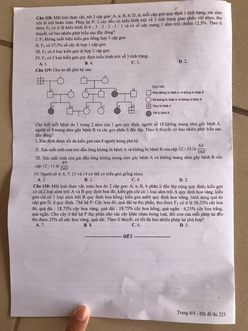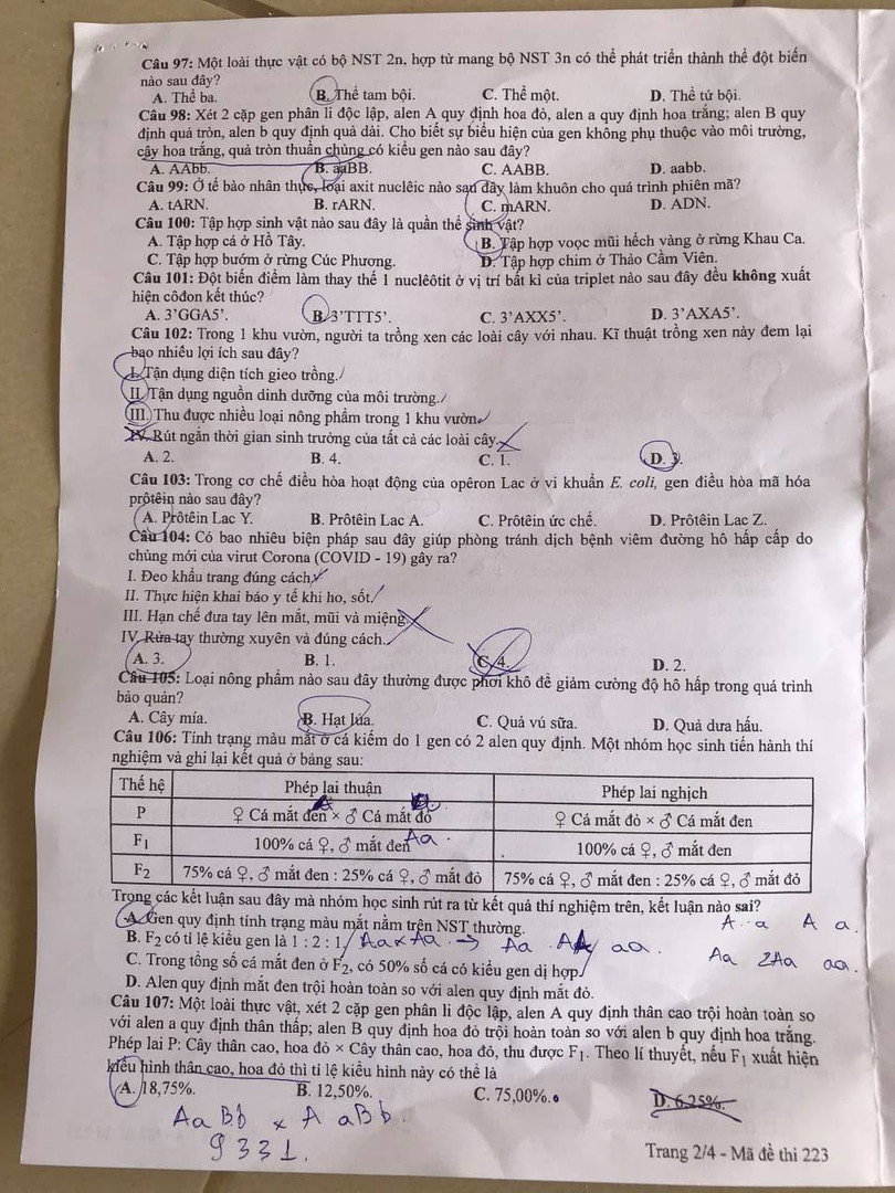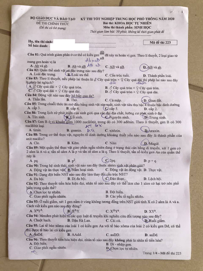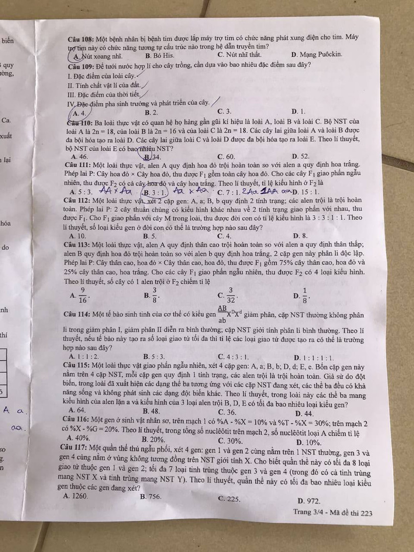 Đề thi môn Hóa học mã đề 223. Lưu ý đáp án khoanh trong đề không phải là đáp án tham khảo.