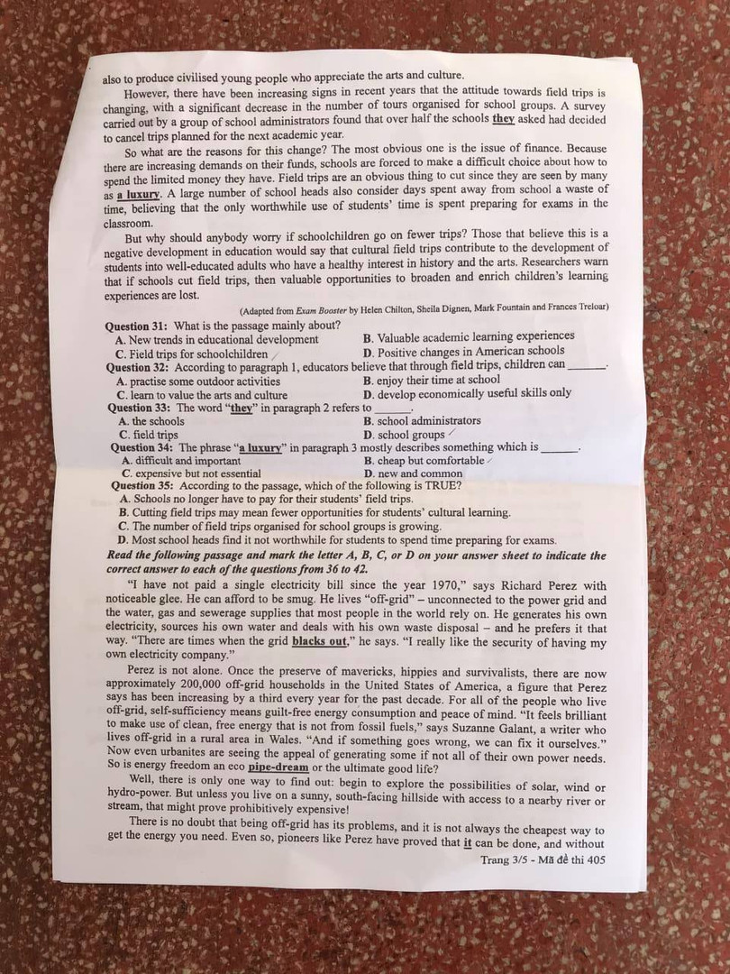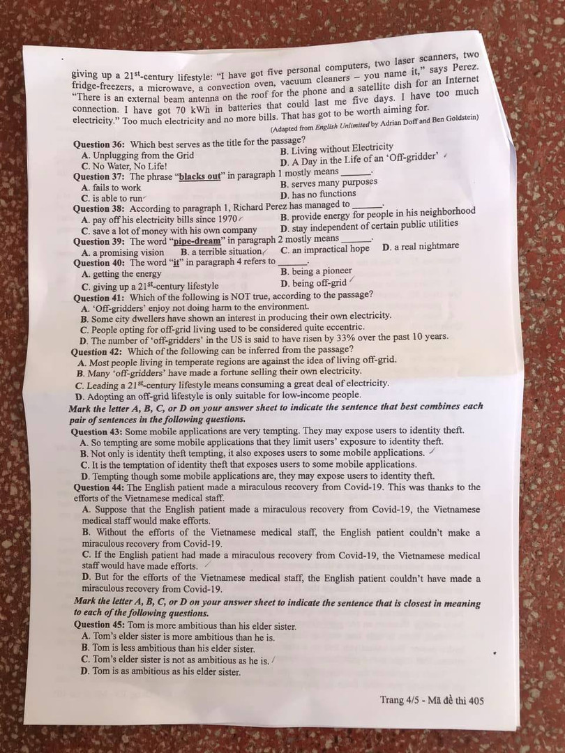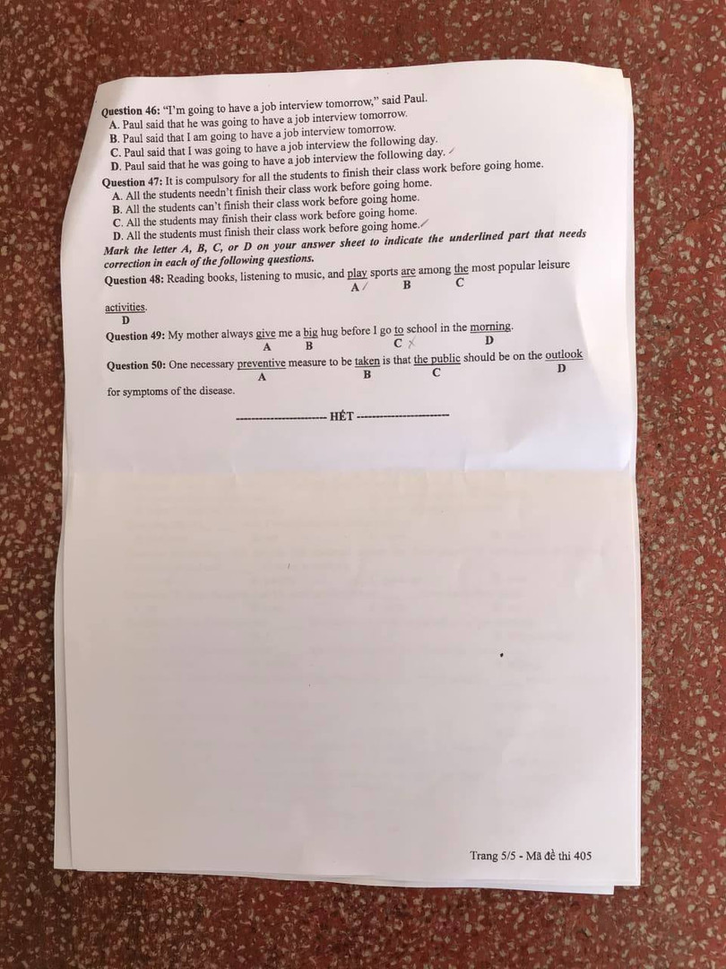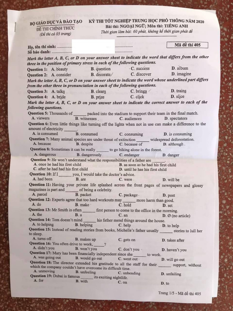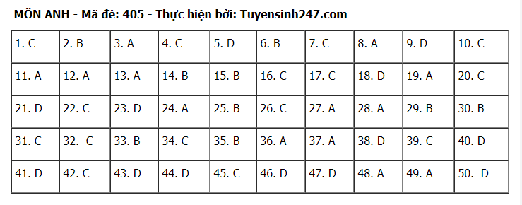 VietTimes – Đáp án đề thi tốt nghiệp THPT năm 2020 môn tiếng Anh mã đề 405 được VietTimes cập nhật nhanh chóng, chính xác. Chúc sĩ tử có kỳ thi tốt nghiệp THPT thành công!