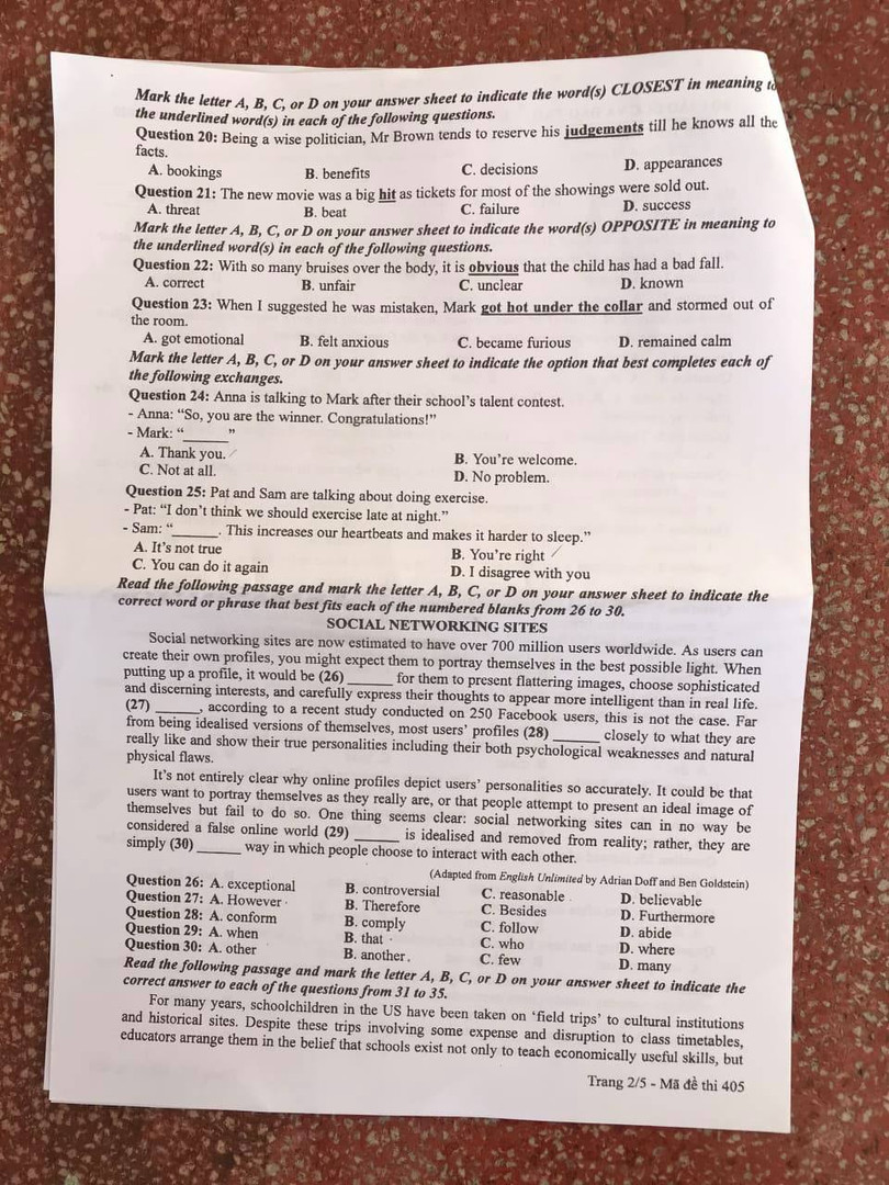 Đề thi và đáp án tham khảo đề thi tốt nghiệp THPT năm 2020 môn tiếng Anh mã đề 405 sẽ được cập nhật dưới đây.