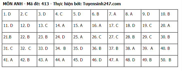 Đề thi và đáp án tham khảo đề thi tốt nghiệp THPT năm 2020 môn tiếng Anh mã đề 413 sẽ được cập nhật dưới đây.