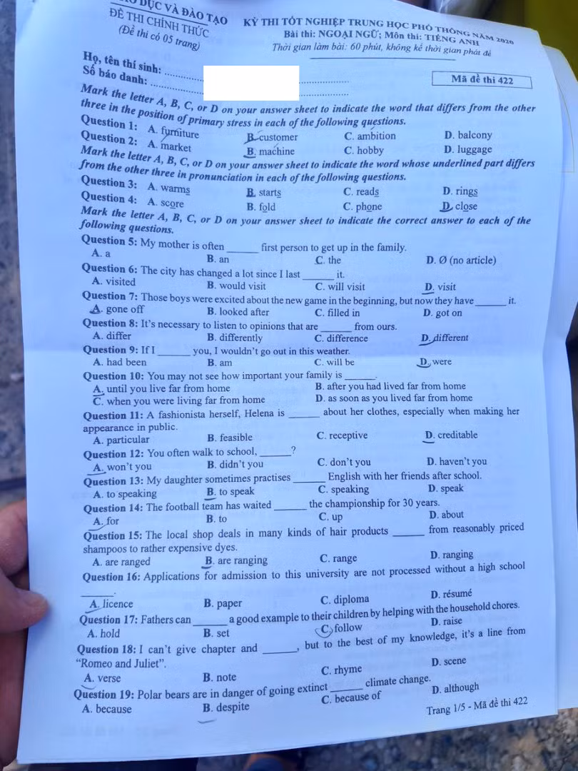 Đề thi và đáp án tham khảo đề thi tốt nghiệp THPT năm 2020 môn tiếng Anh mã đề 422 sẽ được cập nhật dưới đây.