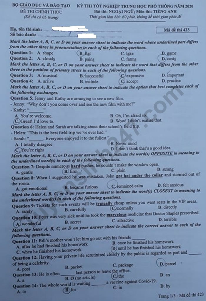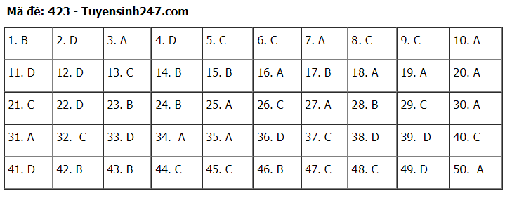 Đáp án đề thi Anh tốt nghiệp THPT 2020 mã đề 423, tra cứu đáp án đề thi môn tiếng Anh THPT 2020 mã đề 423, đáp án tham khảo môn tiếng Anh mã đề 423
