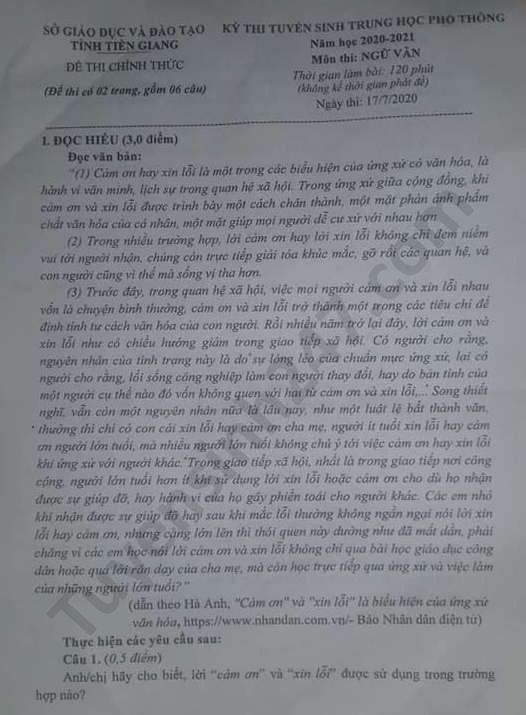 VietTimes – Đáp án đề thi môn Ngữ Văn tỉnh Tiền Giang năm 2020 được VietTimes cập nhật nhanh chóng, chính xác. Chúc sĩ tử có kỳ thi tuyển sinh vào lớp 10 thành công!