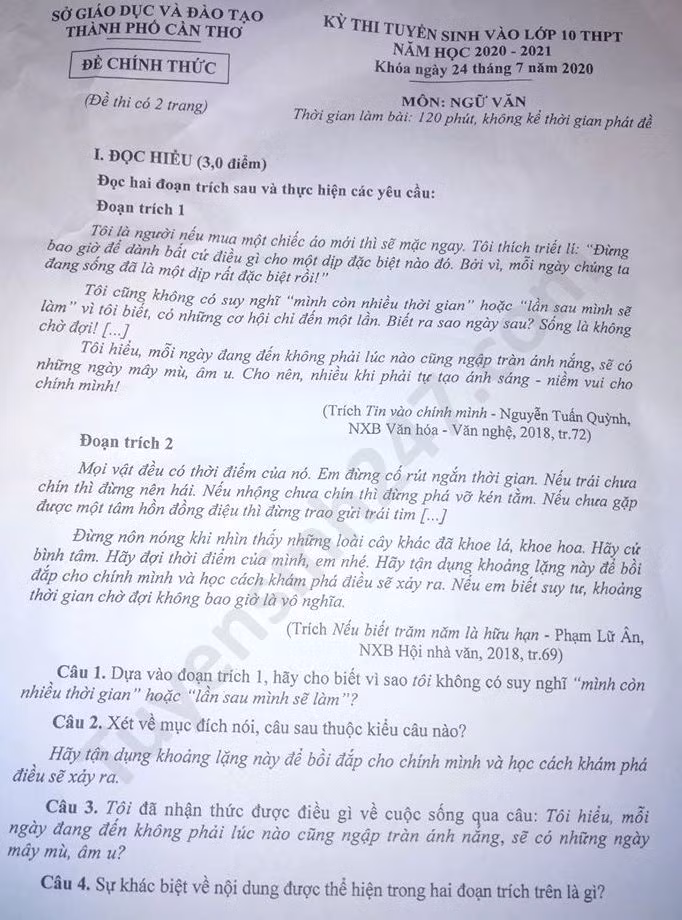 Đề thi tuyển sinh vào lớp 10 môn Ngữ Văn TP Cần Thơ năm 2020. Nguồn: TTHN